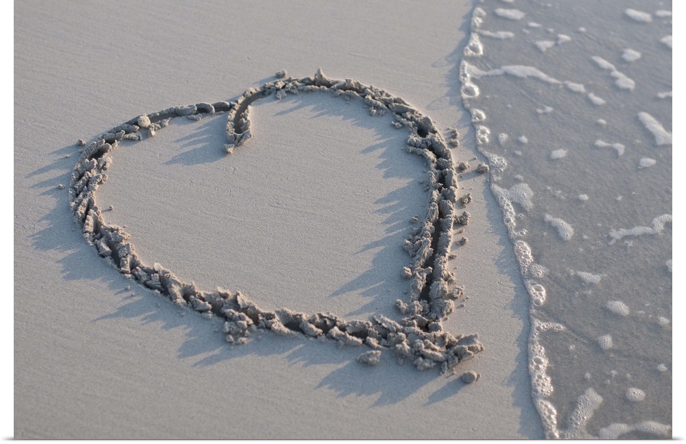 <p>A heart drawn in the sand with the tide coming in to one side</p>