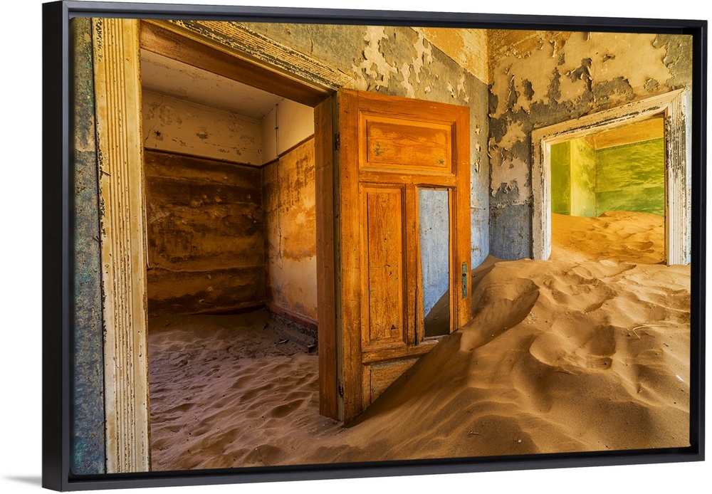 <p>Sand in the rooms of a colourful and abandoned house. Kolmanskop, Namibia.</p>