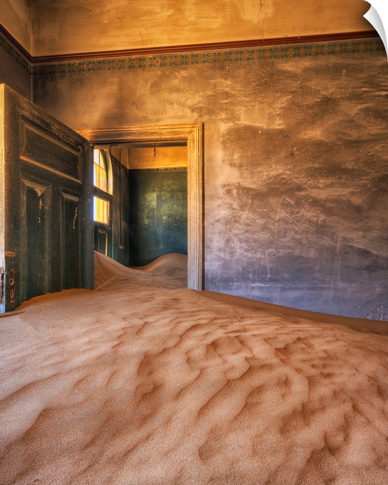 <p>Sand in the rooms of a colourful and abandoned house. Kolmanskop, Namibia.</p>