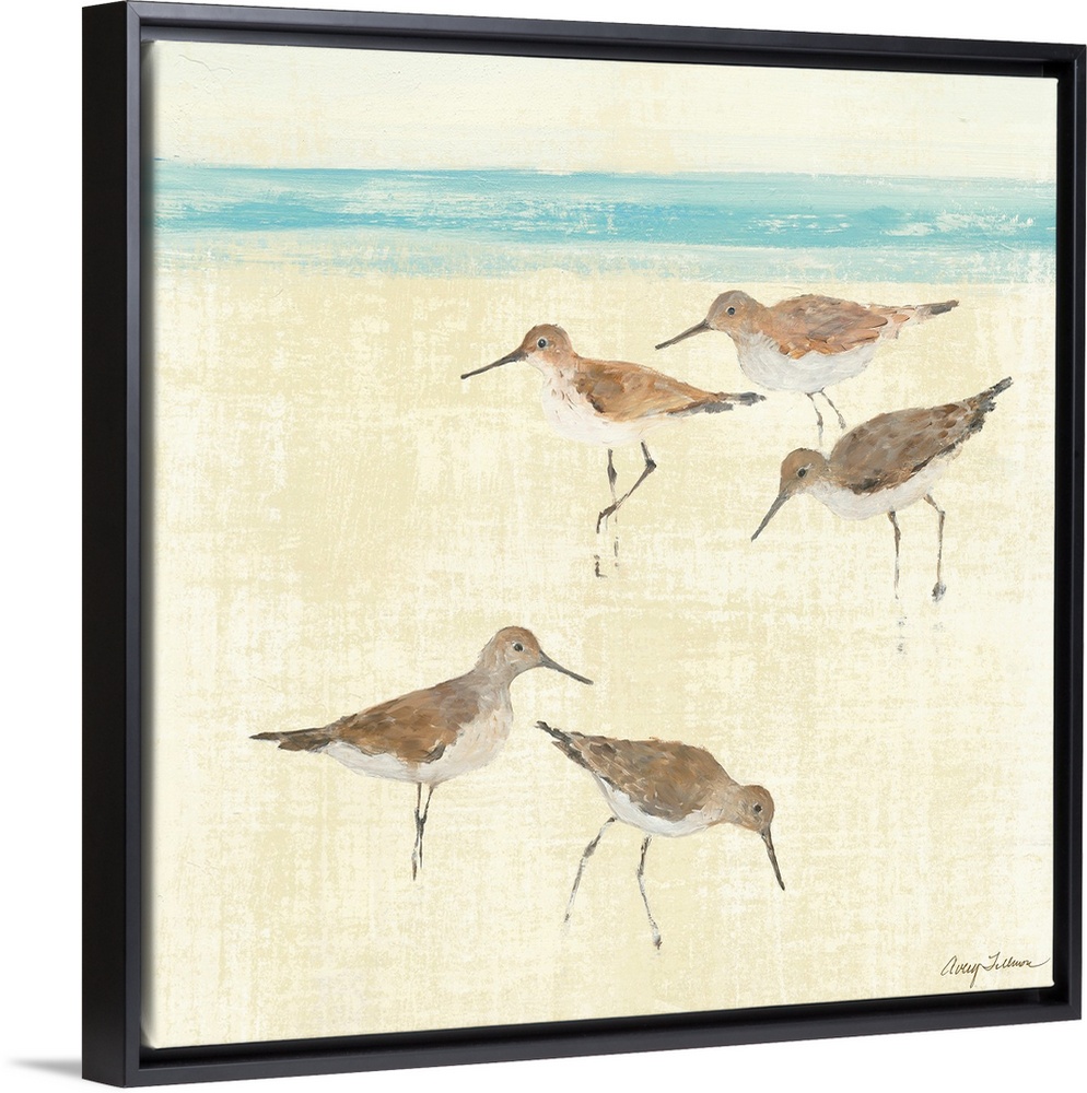<p>Square painting of ocean birds walking on the sand of a beach with the sea in the distance.</p>