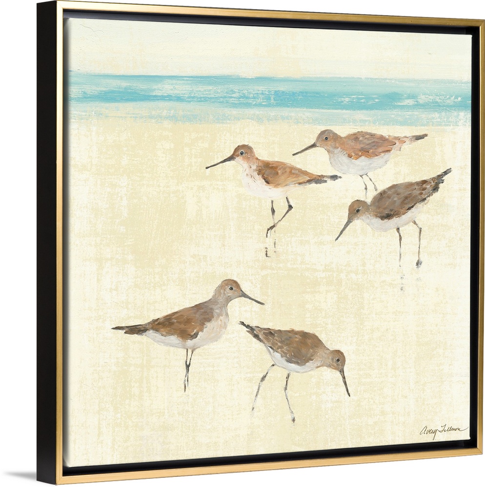<p>Square painting of ocean birds walking on the sand of a beach with the sea in the distance.</p>