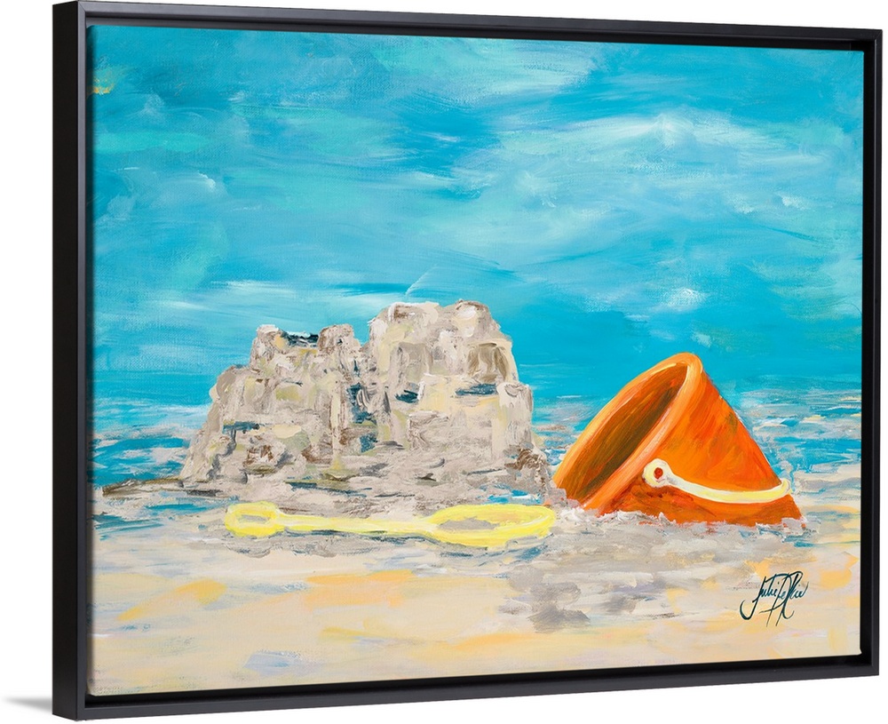 <p>Painting of a shovel and pail in the sand next to a small sandcastle.</p>
