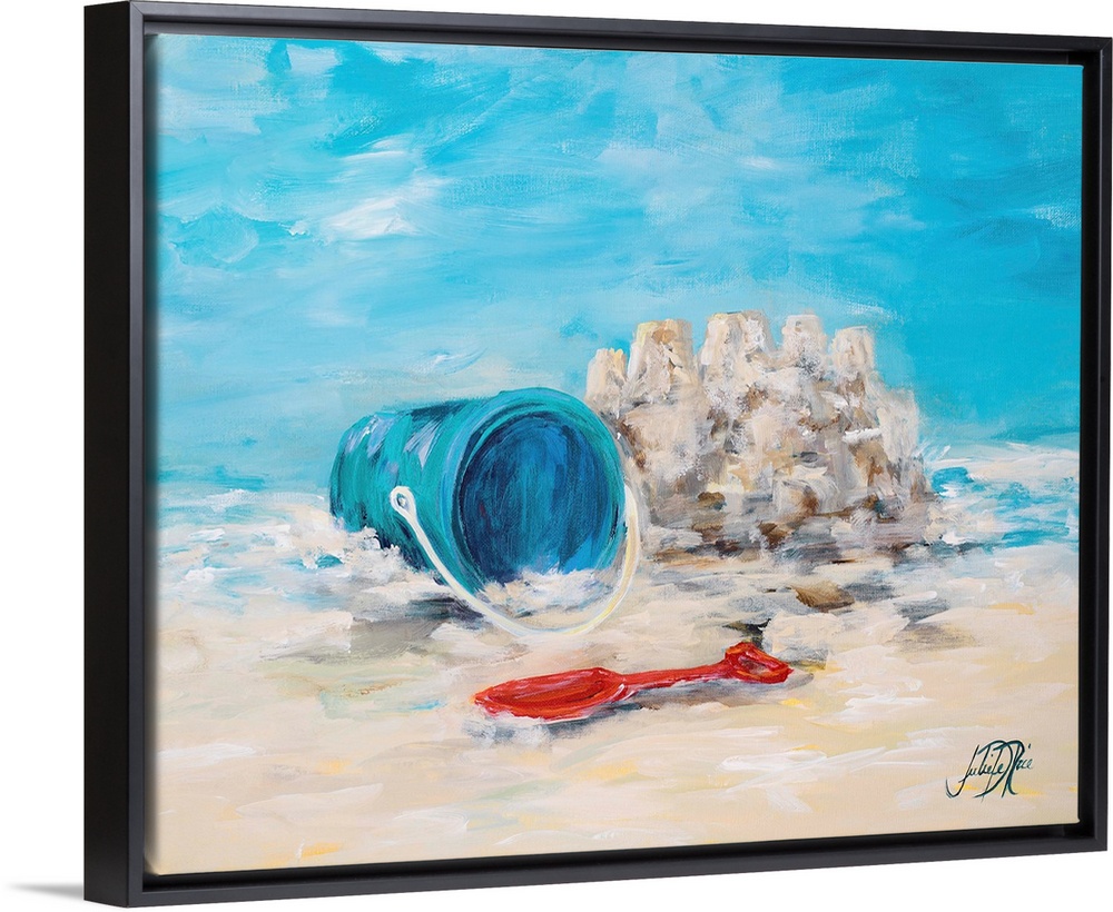 <p>Painting of a shovel and pail in the sand next to a small sandcastle.</p>