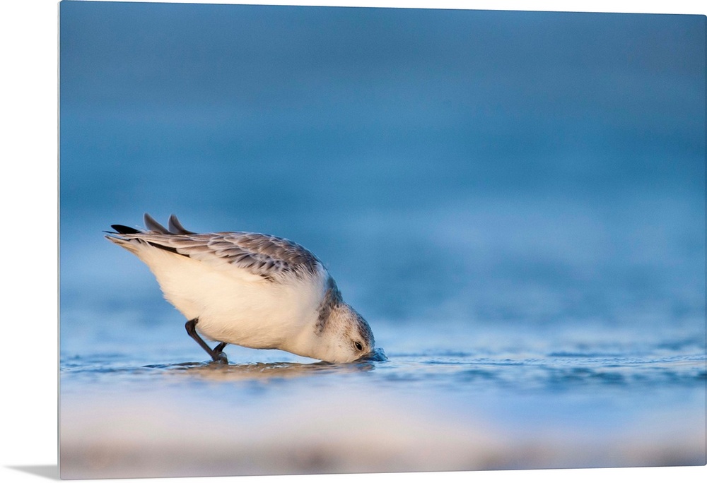 <p>A little Sanderling bird digs into the sand in search of food.</p>