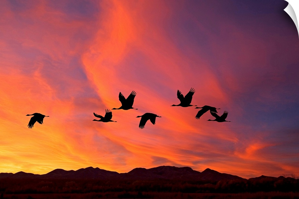 <p>Shilhouetted flock of sandhill cranes flying in the fire-like sunset sky.</p>