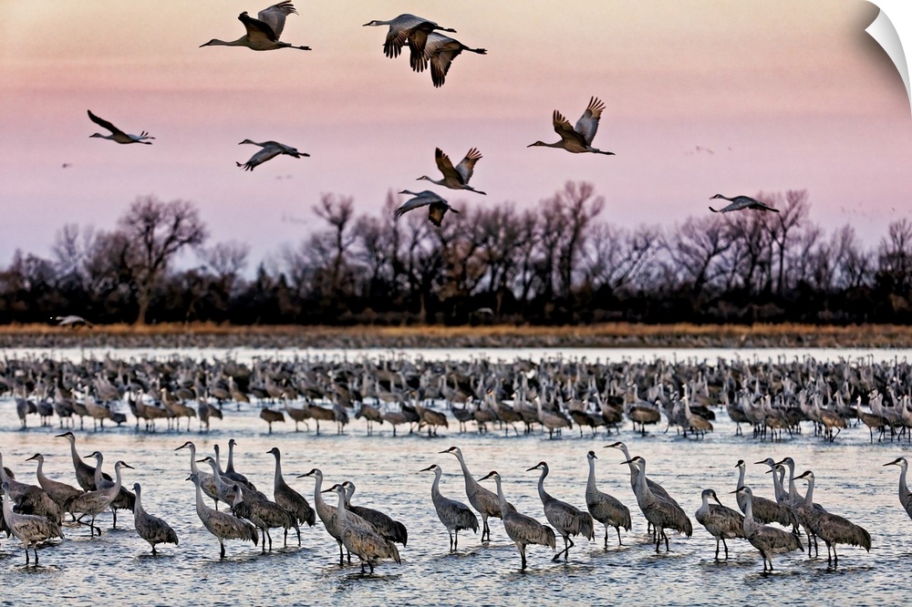 <p>Sandhill cranes (Grus canadensis) fly in to roost in the shallows of the Platte River. Every year 400,000 to 600,000 sandhill cranes-80 percent of all the cranes on the planet-congregate along an 80-mile stretch of the central Platte River in Nebraska, to fatten up on waste grain in the empty cornfields in preparation for the journey to their Arctic and subarctic nesting grounds. Sandhill cranes among the world's oldest living birds and one of the planet's most successful life-forms, having outlasted millions of species (99 percent of species that ever existed are now extinct); Wood River, Nebraska, United States of America</p>