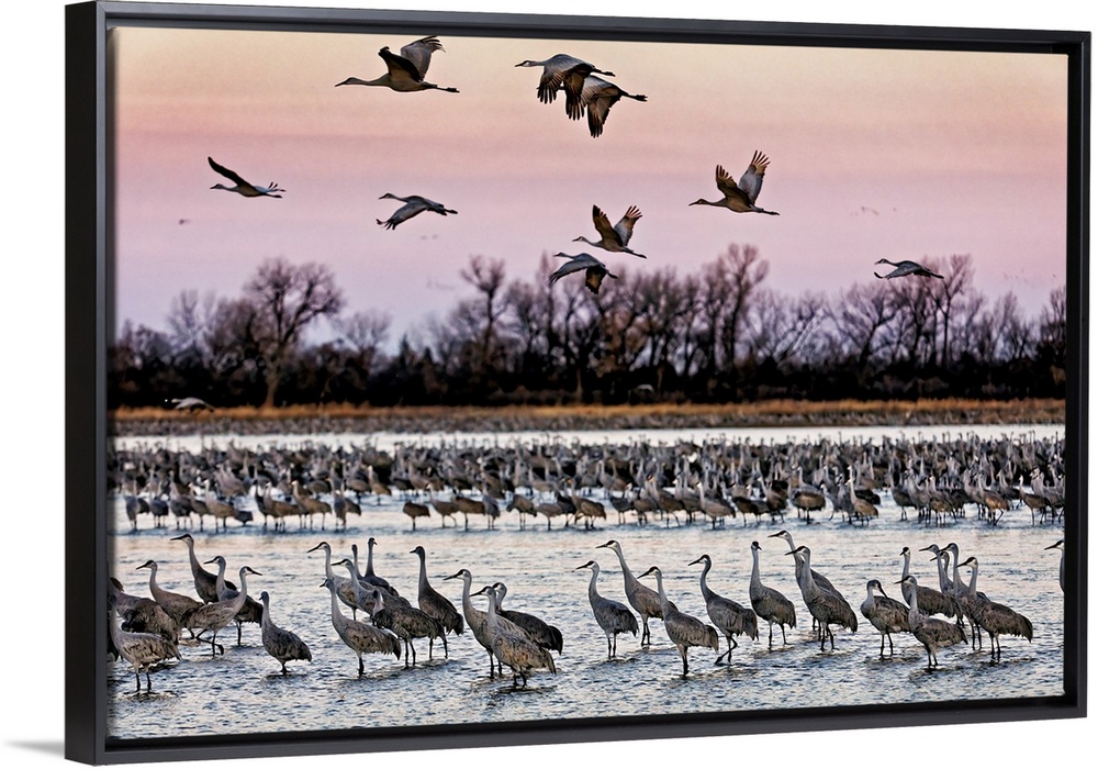 <p>Sandhill cranes (Grus canadensis) fly in to roost in the shallows of the Platte River. Every year 400,000 to 600,000 sandhill cranes-80 percent of all the cranes on the planet-congregate along an 80-mile stretch of the central Platte River in Nebraska, to fatten up on waste grain in the empty cornfields in preparation for the journey to their Arctic and subarctic nesting grounds. Sandhill cranes among the world's oldest living birds and one of the planet's most successful life-forms, having outlasted millions of species (99 percent of species that ever existed are now extinct); Wood River, Nebraska, United States of America</p>
