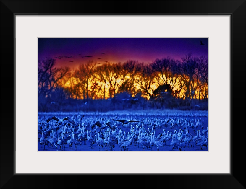 <p>Morning breaks with warm rays of sun over cool blue light of dawn as Sandhill cranes (Grus canadensis) fly in to sit in two inches of precious Ogallala water on the Platte River. Grassland birds of the Great Plains migrate from Siberia and Canada to the southern United States and Northern Mexico. Their main migratory path is north-south and then in reverse as they fly in to breed in the High Plains aquifer. The birds path is constrained by the Rocky Mountains much in the same as the ancient aquifer. Birds depend on these protected waterways creating an hourglass shape in their migration making a wide path following to the narrow choke point at Kearney on the Platte River. Nearly a half million migrating Sand Hill Cranes fly in to Crane Trust property and adjacent farmland; Wood River, Nebraska, United States of America</p>