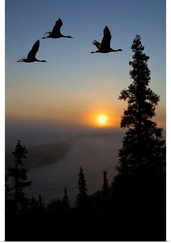 <p>Sandhill Cranes take flight at sunrise from their roosting area on top of a ridge to their feeding area near Kulik Lake, Katmai National Park, Alaska.Composite.</p>