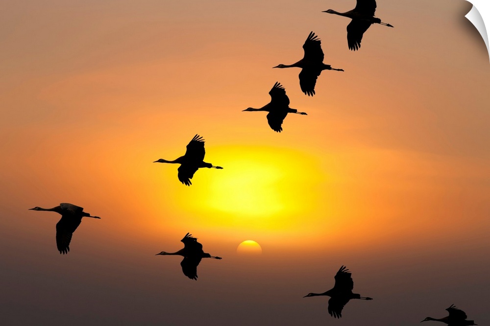 <p>Sandhill Cranes take flight at sunrise from their roosting area on top of a ridge to their feeding area near Kulik Lake, Katmai National Park, Alaska.composite</p>