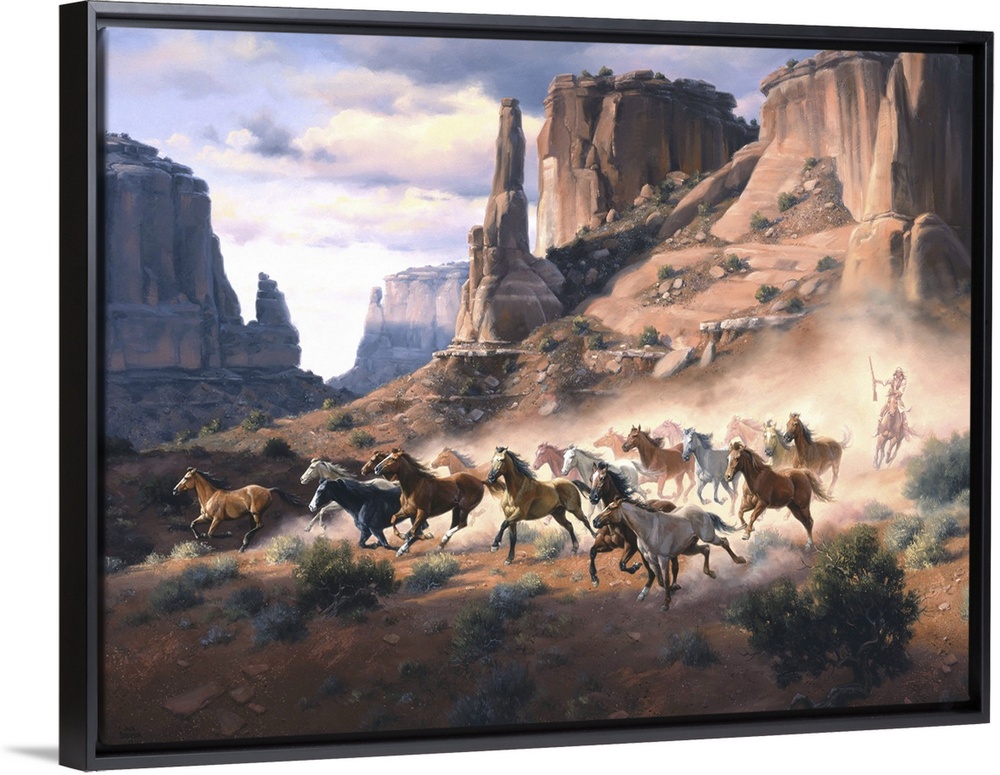 <p>Contemporary Western artwork of a stampeding herd of horses kicking up dust in a rocky desert canyon.</p>