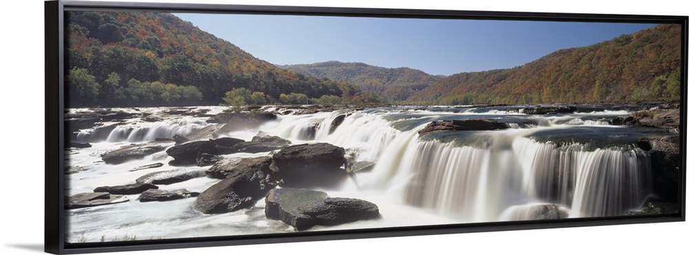 <p>Panoramic image on canvas of long waterfalls with rolling mountains of fall foliage in the background.</p>