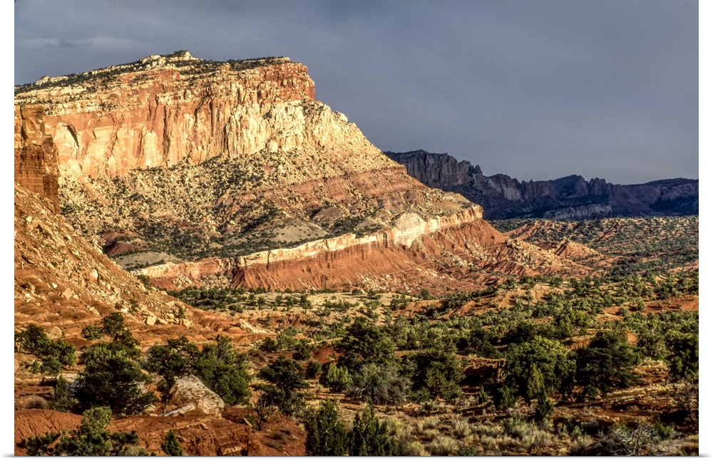 <p>Sandstone rock formations along the valley covered in juniper trees (Juniper scopulorum) in Capitol Reef National Park Utah, United States of America</p>
