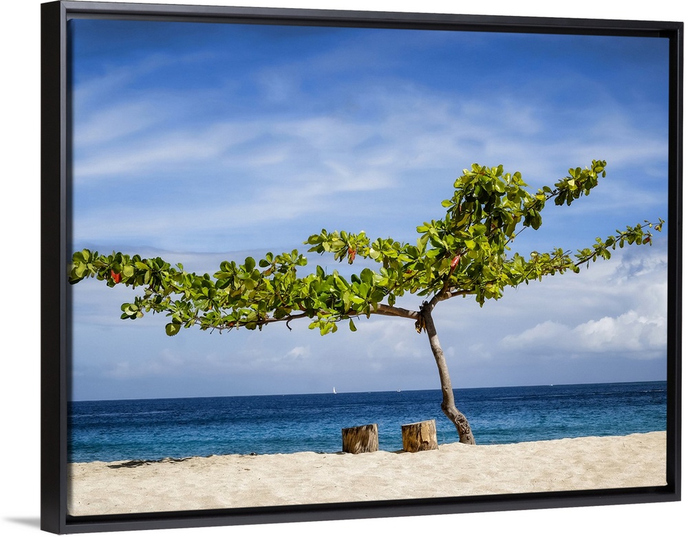 <p>A tree and two tree stumps for seats on a sandy beach with a view of the blue ocean, Caribbean</p>
