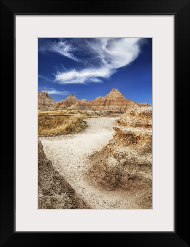 <p>Sandy path leads through the striated peaks to the higher peaks in the background stark against a blue sky.</p>