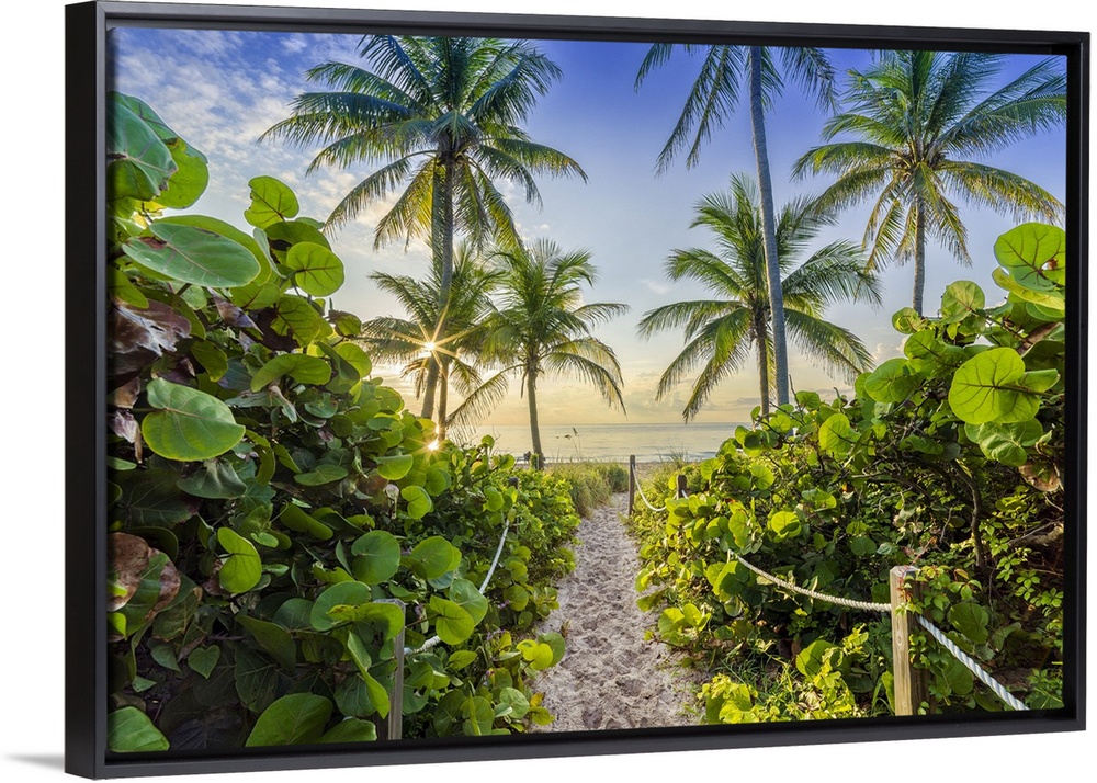 <p>Sandy Path to the Beach surrounded by tropical palm trees, at sunrise Hollywood Beach Hollywood, Miami Beach Florida, USA</p>