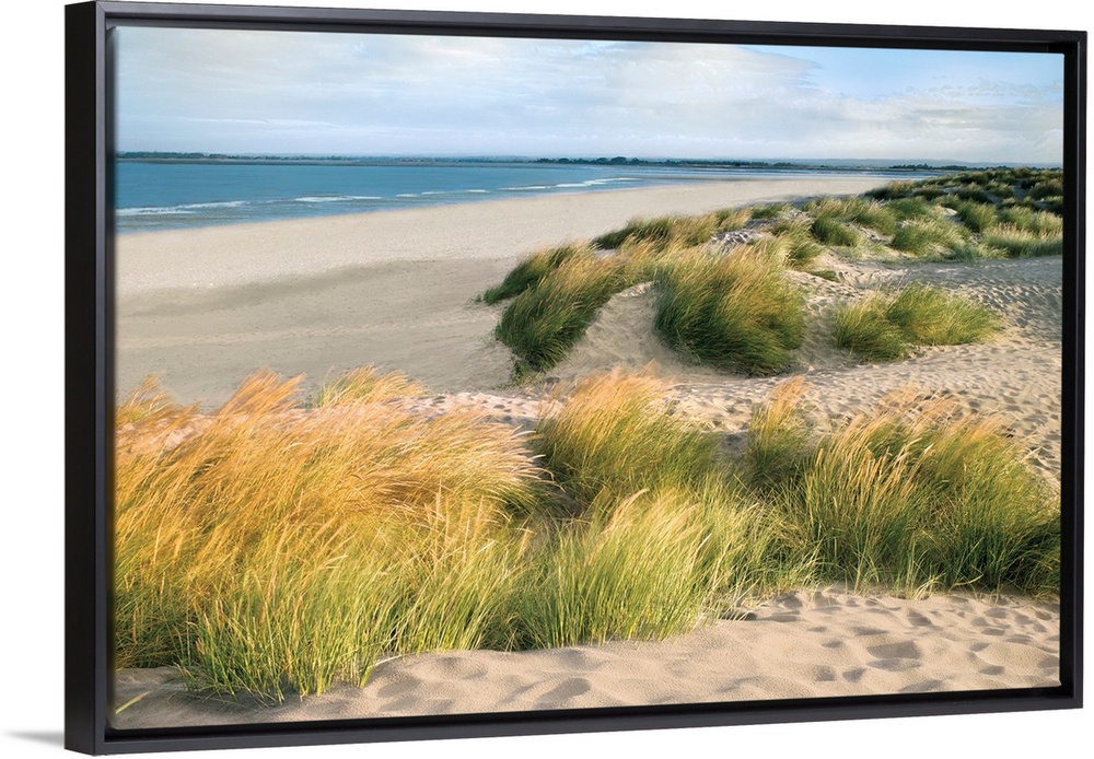<p>Photograph of beach with grass covered dunes, on a cloudy day.</p>