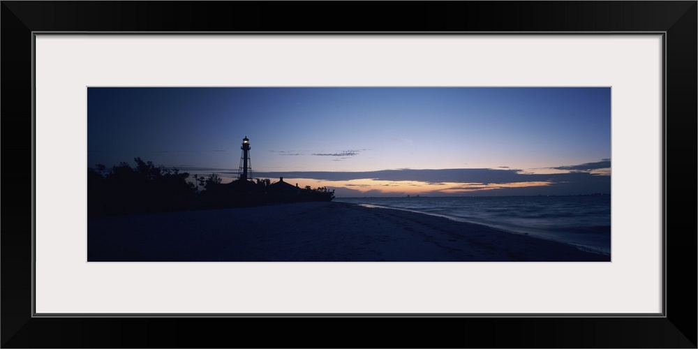 <p>Wide angle photograph on a large canvas of the shoreline at Sanibel Island, in the darkness of early dawn, the Sanibel Island lighthouse in the distance, in Fort Myers, Florida.</p>