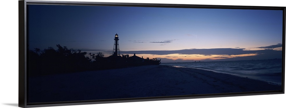 <p>Wide angle photograph on a large canvas of the shoreline at Sanibel Island, in the darkness of early dawn, the Sanibel Island lighthouse in the distance, in Fort Myers, Florida.</p>