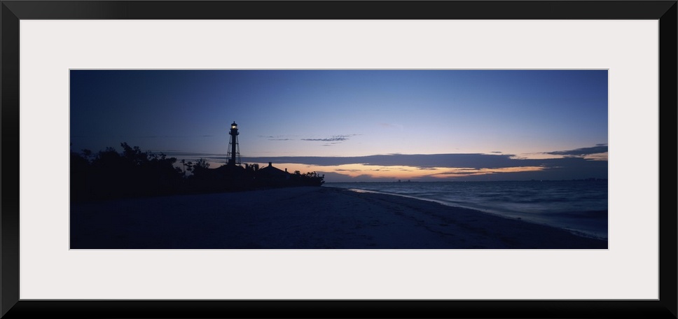 <p>Wide angle photograph on a large canvas of the shoreline at Sanibel Island, in the darkness of early dawn, the Sanibel Island lighthouse in the distance, in Fort Myers, Florida.</p>