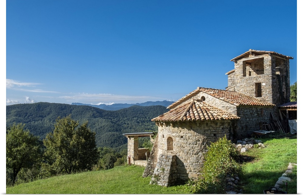 <p>Sant Marti de Toralles Norman church and the Garrotxa Volcanic Zone Natural Park, Pyrenees, Catalonia, Spain, Europe</p>