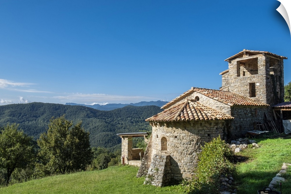 <p>Sant Marti de Toralles Norman church and the Garrotxa Volcanic Zone Natural Park, Pyrenees, Catalonia, Spain, Europe</p>