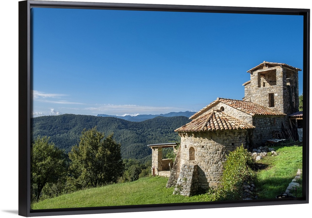 <p>Sant Marti de Toralles Norman church and the Garrotxa Volcanic Zone Natural Park, Pyrenees, Catalonia, Spain, Europe</p>