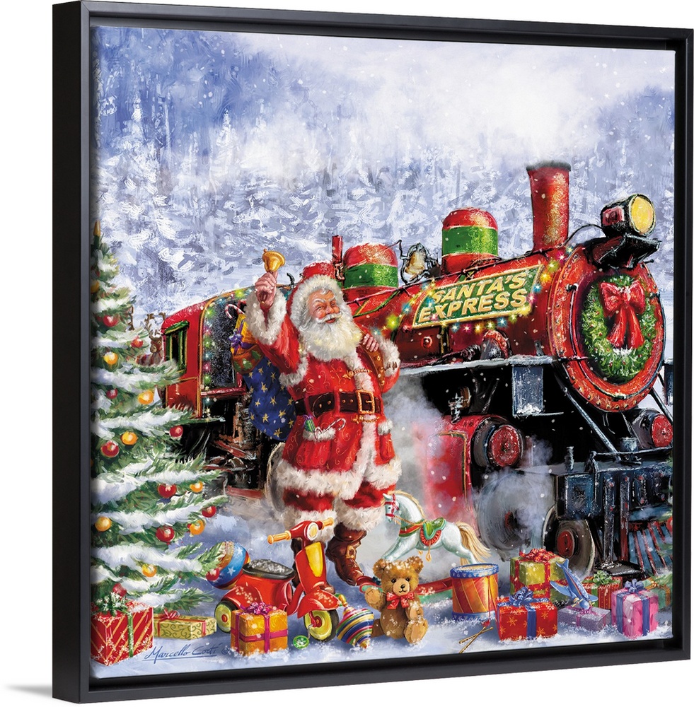 <p>Contemporary painting of Santa with the Santa Express train and many toys on a snowy night.</p>