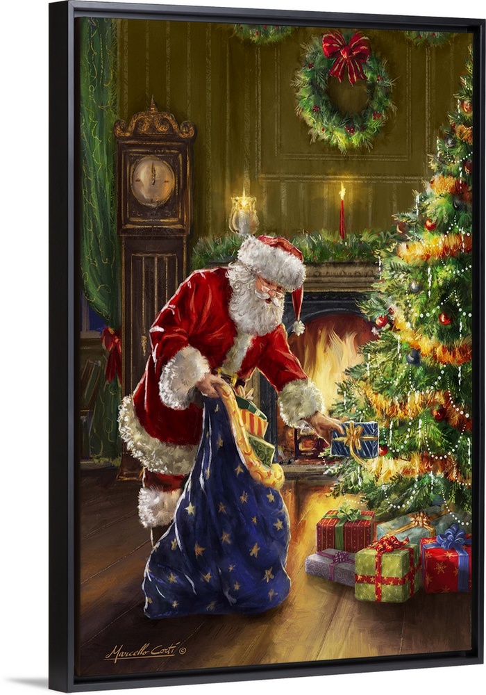<p>Contemporary painting of Santa placing gifts on a Christmas tree from his blue sack with a fire blazing in the fireplace behind him.</p>