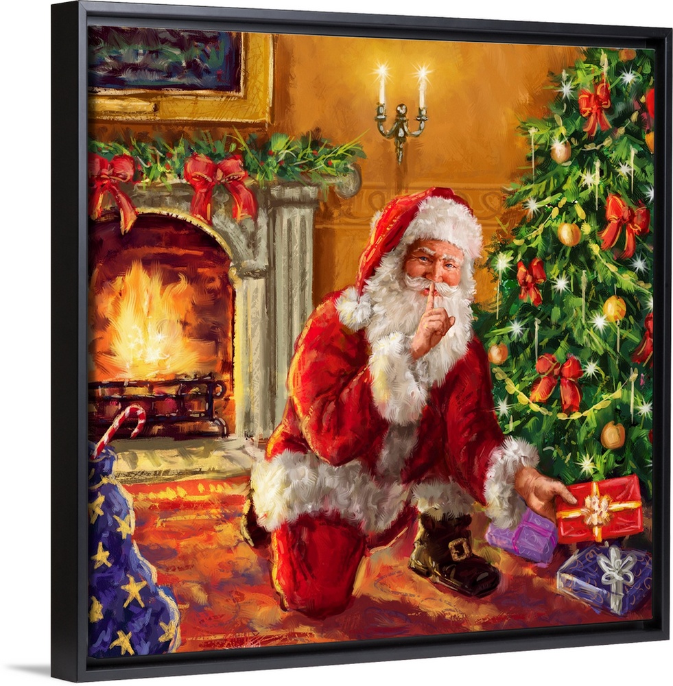 <p>A contemporary painting of Santa putting presents on a Christmas tree while signalling to be quiet.</p>