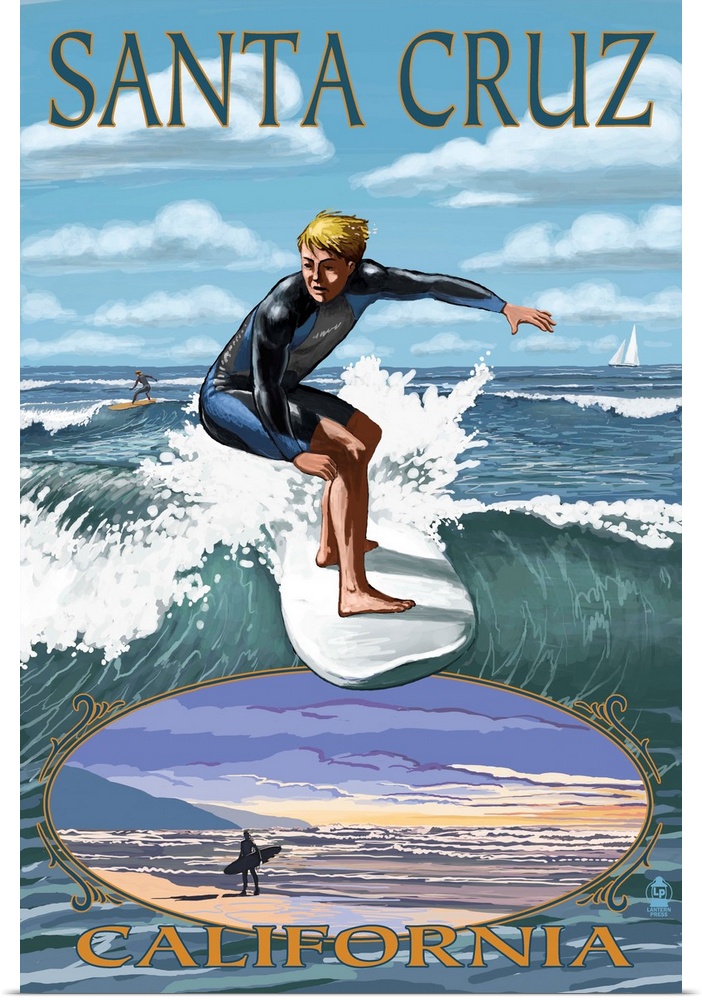 <p>Retro stylized art poster of a surfer riding a wave. With a vignette of a surfer walking along the beach at the bottom of the image.</p>