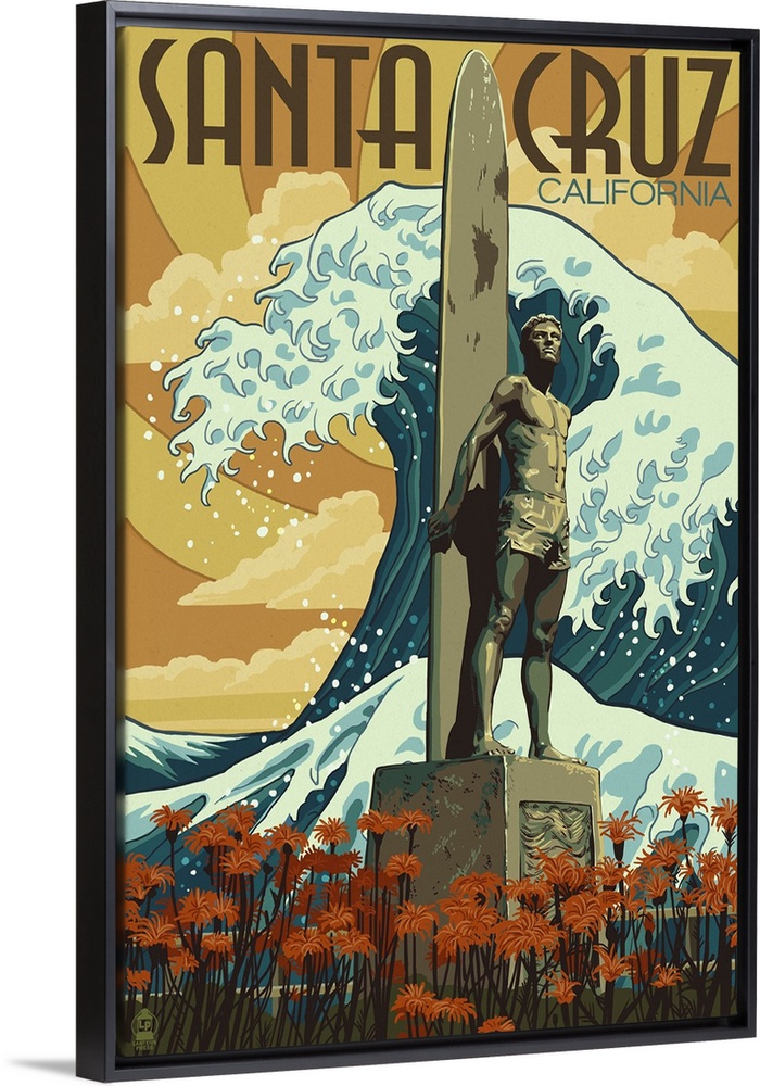 <p>Retro stylized art poster of a statue of a surfer with a longboard, with a giant wave in the background.</p>