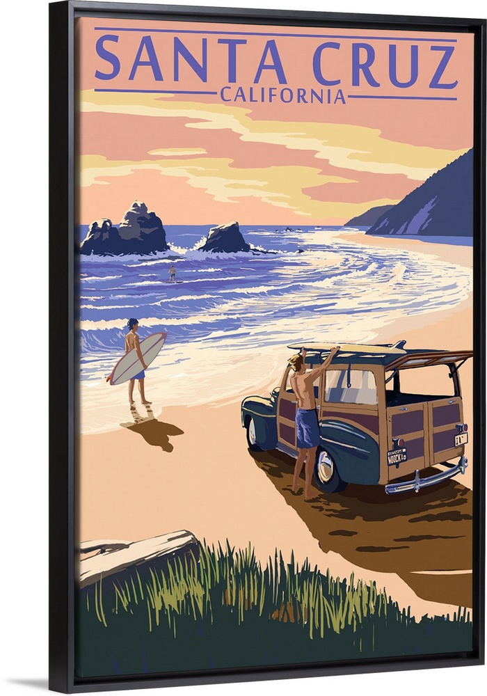 <p>Retro stylized art poster of a vintage woody wagon with surfers on the beach at sunset.</p>