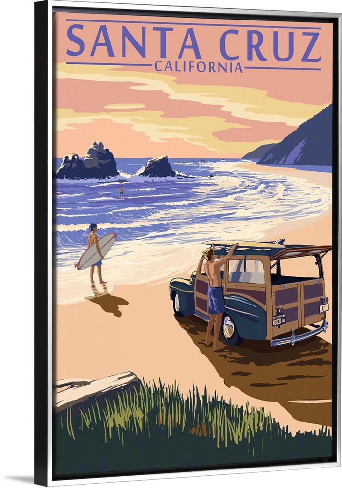 <p>Retro stylized art poster of a vintage woody wagon with surfers on the beach at sunset.</p>