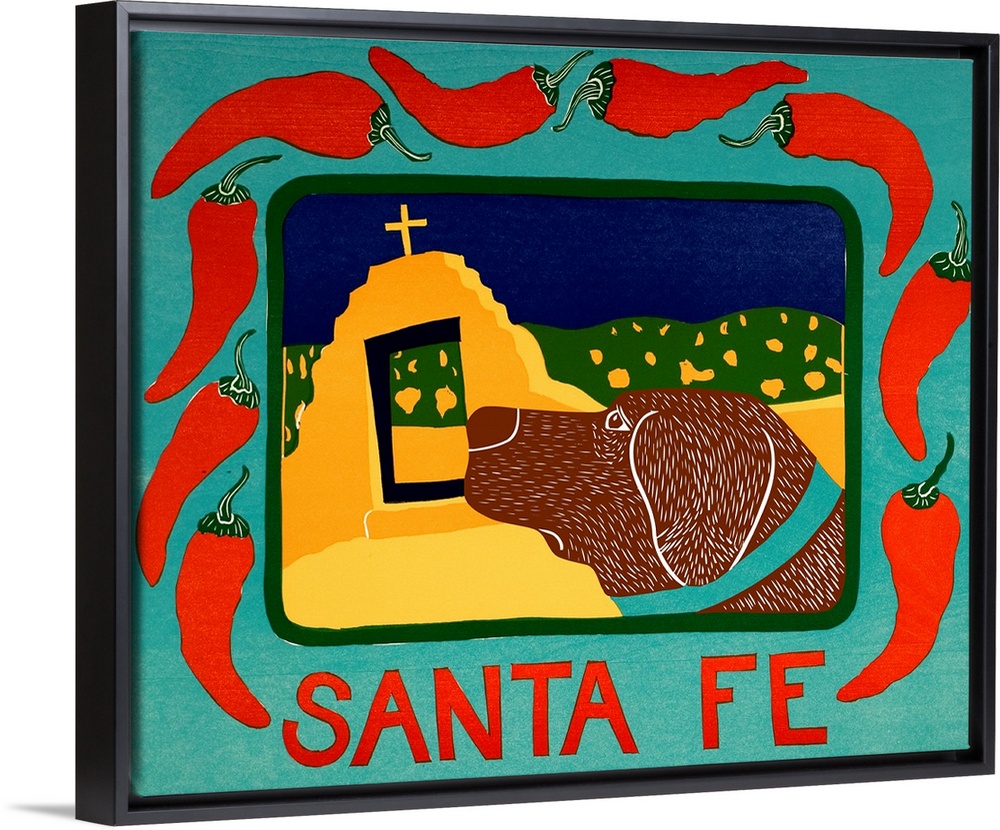 <p>Illustration of a chocolate lab in Santa Fe framed in a blue frame with red chilies on it and the word "Santa Fe"</p>