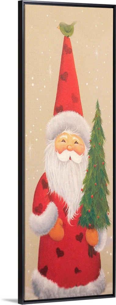 <p>Santa holding a Christmas tree and a bird on top of his hat</p>