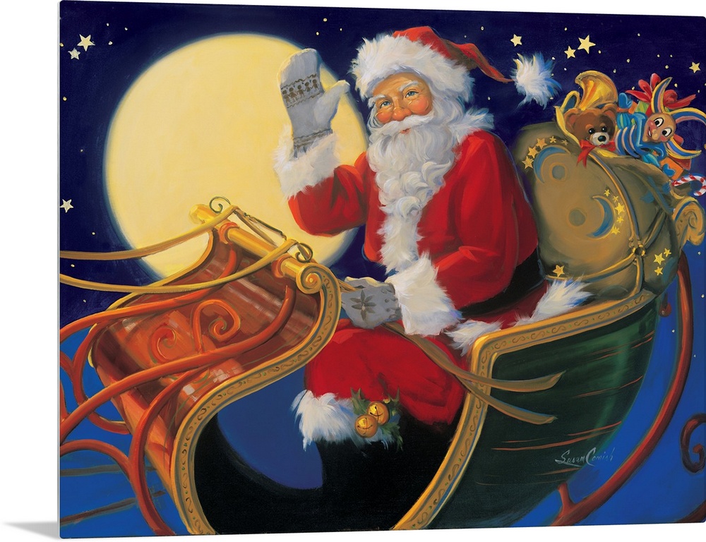 <p>Painting of Santa Claus waving from his sleigh at night.</p>