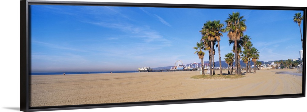<p>Wide angle photograph taken on a sunny day of Santa Monica beach with a patch of palm trees toward the back near a foot path. The pier can be seen in the distance.</p>