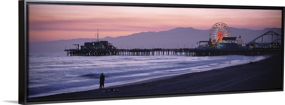 <p>A panoramic shot taken of the Santa Monica pier during sun down with a couple standing on the beach at the waters edge.</p>