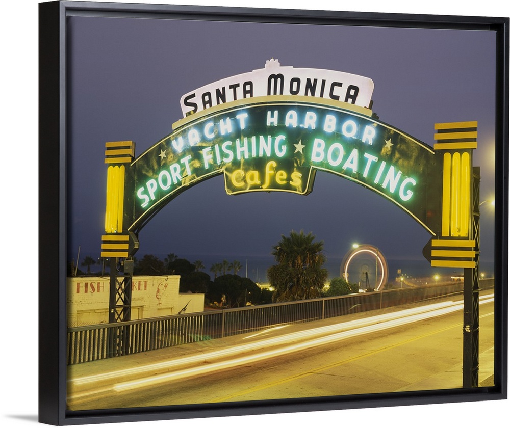 <p>Long exposure shot of a lit up Santa Monica Pier sign at night as traffic headlights go by and the Ferris wheel spins in the background.</p>