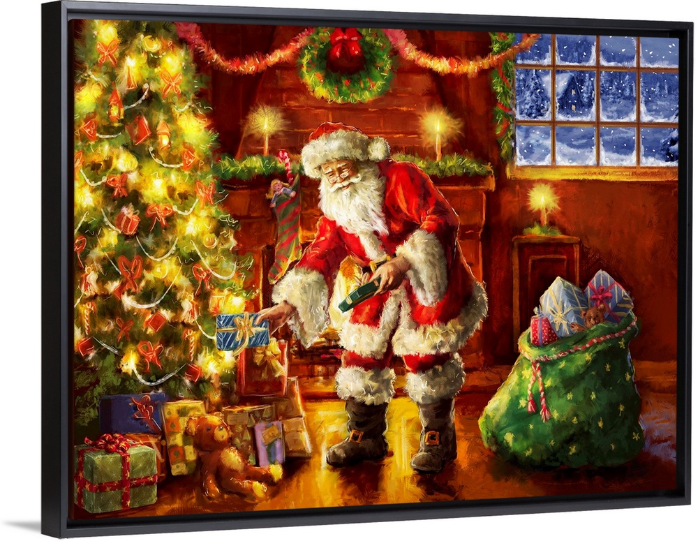 <p>A traditional painting of Santa placing gifts under a Christmas tree in front of a fireplace.</p>
