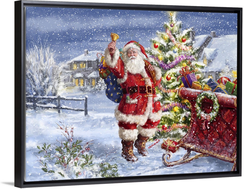 <p>A traditional image of Santa, ringing a bell, beside his sleigh in a neighborhood while snow is falling.</p>