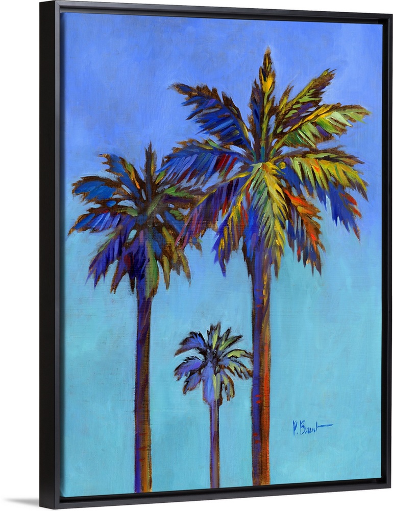 <p>Contemporary painting of three palm trees against a bold blue sky.</p>