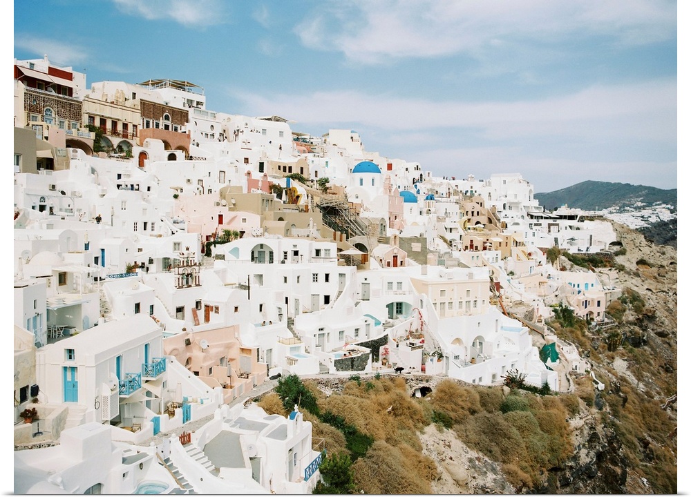 <p>Photograph of the iconic white buildings of Santorini, Greece perched on the hillside.</p>