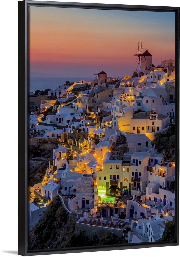 <p>Aerial view of Santorini in Greece at sunset.</p>