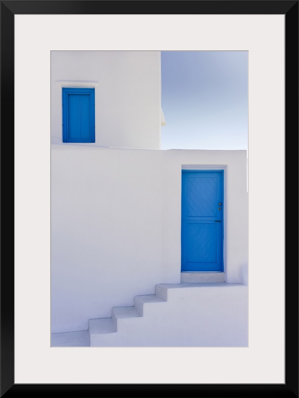 <p>Santorini, Cyclades Islands, Greece. Minimal architecture, white walls and stair, blue door and window.</p>