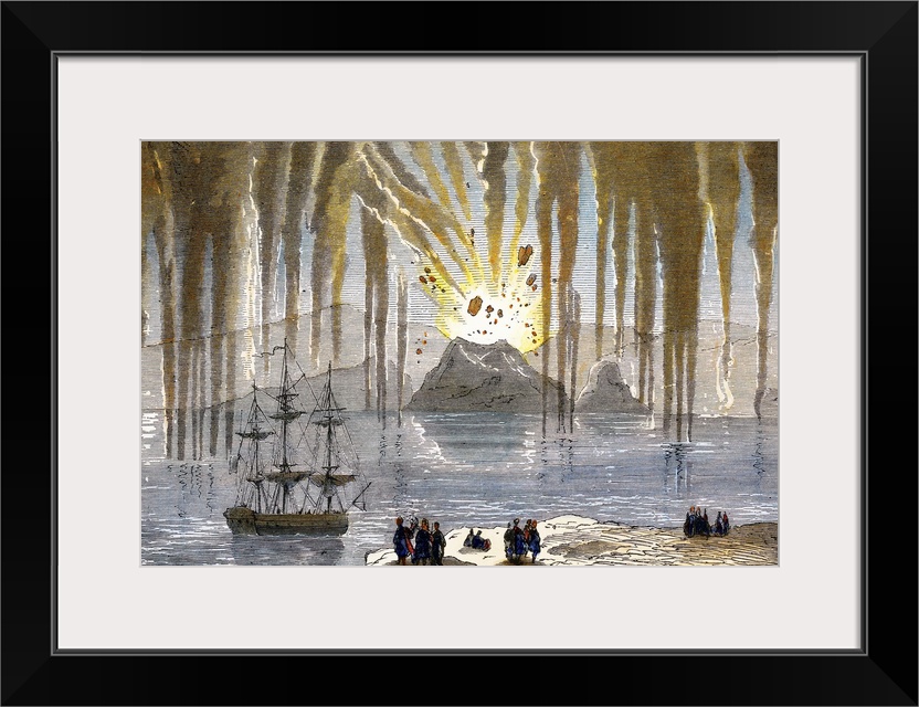 <p>Santorini eruption. Historical artwork depicting a volcanic eruption by the island of Nea Kameni in 1866. This eruption, in the Santorini group of islands in Greece, was part of a series of volcanic events which tripled the size of Nea Kameni. 140 million cubic metres of lava were produced in the period from 1866 to 1870. It is believed that a catastrophic eruption in this area around 1600 BC may have destroyed a Minoan island civilisation which was based here, leading to the myth of the lost city of Atlantis.</p>