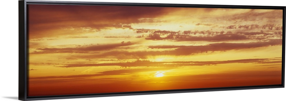 <p>Panoramic photo on canvas of a brightly colored sunset with horizontal clouds.</p>