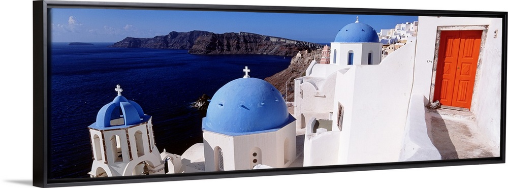 <p>Panoramic photograph of whitewashed buildings with colorful roofs near coastline with mountains in the distance.</p>