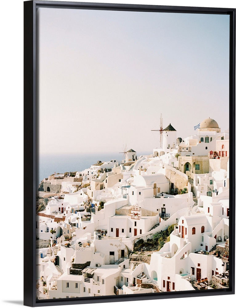 <p>A photograph of the iconic white stucco buildings and windmills that are characteristic of the hillside town of Santorini, Greece.</p>
